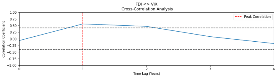 The cross-correlation analysis shows that the only points at which VIX and FDI cross-correlate at a significant level are at a lag of 1 year, where the cross-correlation coefficient is equal to 0.56, and a lag of 2 years, where the coefficient is equal to about 0.47. Evidently, the hypothesis appears to be reinforced as peak causation occurs at a lag of 1 in both the Granger Causality and cross-correlation tests, with a lag of 2 remaining significant to a smaller degree of confidence.