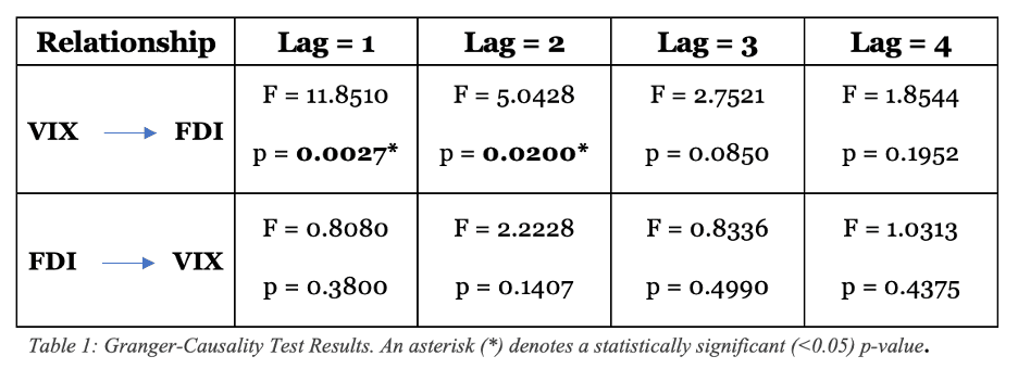 The high F-statistic shows that VIX serves as a predictor of FDI with a lag of 1 and 2 years. The p-value statistic (<0.05) for lags of 1 and 2 confirms that the null hypothesis is rejected with high confidence, further confirming the hypothesis. With a lag of 3 or greater however, the p-value results are not significant enough to confirm causation.