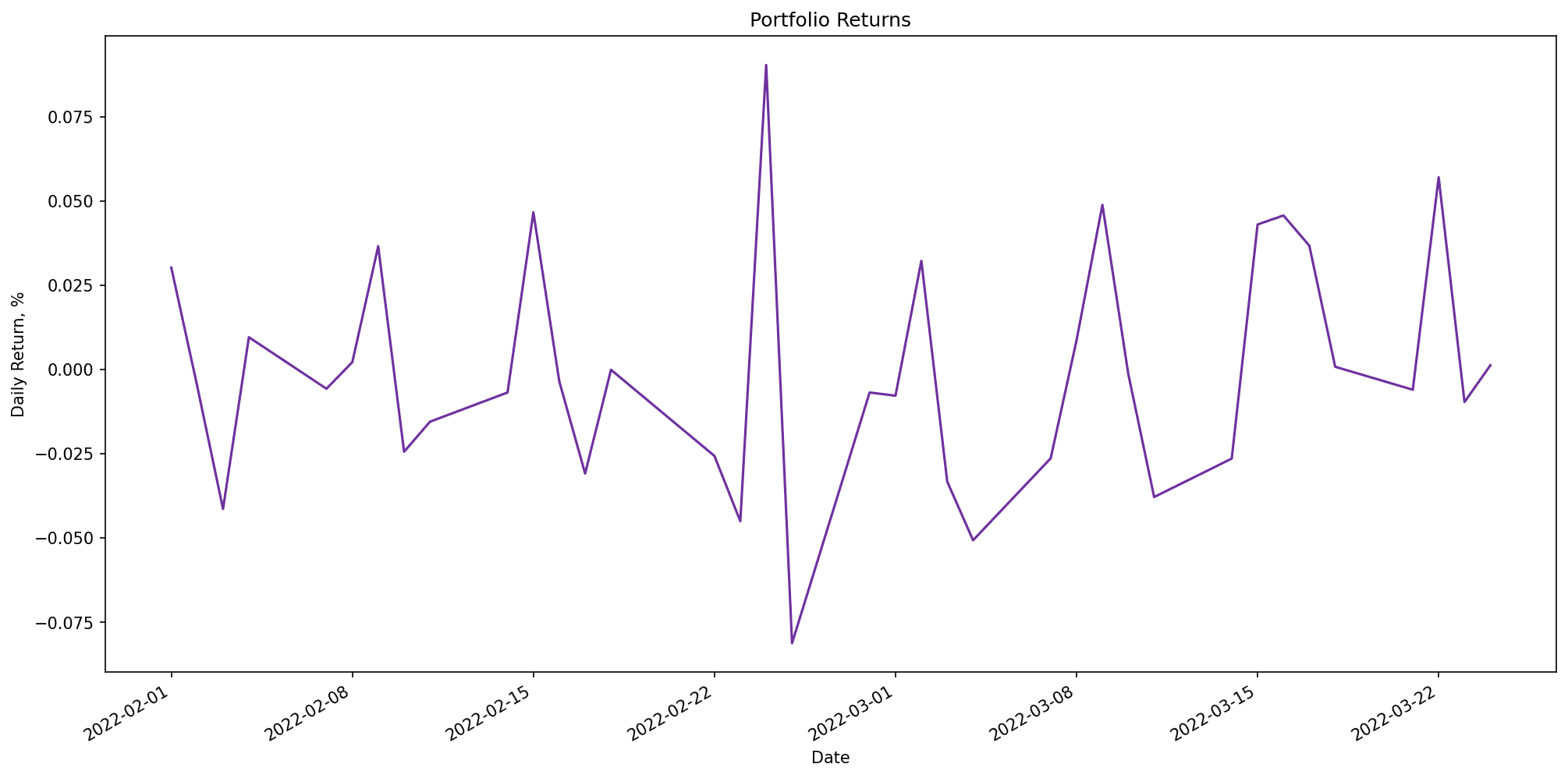 plt.show()The above code block might seem like there’s a lot going on but it’s actually extremely simple. With the first line we assign the weights of each stock - this is the percentage of our portfolio each stock comprises. My portfolio was allocted as such: 30% SPY, 40% OPEN, and 30% CCI - leading to weights of 0.30, 0.40, 0.30 being assigned, respectively. We then use the pct_change() function to find the percentage changes from day-to-day, while the dot() function returns the dot product of our arrays. In combination, the first two lines give us our portfolio returns every day, assigned to “portfolio_returns”.