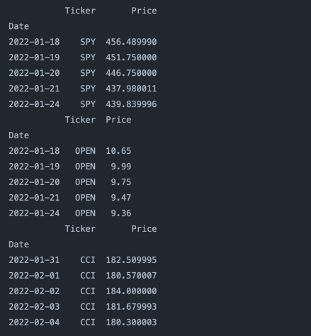 prices = portfolio[["Price_CCI", "Price_OPEN", "Price_SPY"]].round(decimals=2)
