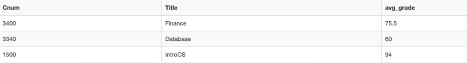 ORDER BY c.Cnum DESCWe can use an aggregate function (in this case, the AVG function) when we SELECT the record that we need to pull. The AVG() function returns the average grade, aliased as avg_grade for readability in the resulting table. However, don’t forget that if you have an aggregate function you also need a GROUP BY function for SQL to run the aggregate function over. Otherwise, MySQL won’t know what to you want it to find the average with respect to. HAVING COUNT(DISTINCT ID) >= 2 may seem like a verbose line of code, but in reality it’s quite simple. The COUNT command counts the number of distinct IDs taking each course. The HAVING command then only returns true if the number of distinct IDs in a course are greater than or equal to 2. That’s it. Simple! The last line in the query, the ORDER BY clause orders the queries results by course number, in descending order.