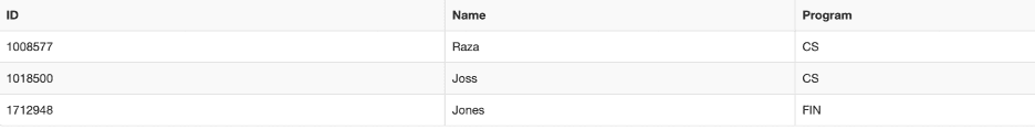('1712948', 'Jones', 'FIN');The primary key is ‘ID’ because ‘Name’ and ‘Program’ are going to inevitably have duplicates, but student IDs are unique. Right now, we don’t have another table which relates to this one, but we’ll remedy that in a quick second. Here we’ve inserted into the Student table the individual ID numbers, names, and programs using myself, a few friends of mine, and two fake names (I’m not telling you which is which) as inspiration.