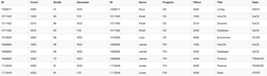 s.IDIf you have a sharp eye you’ll notice the ON command has been replaced with USING. USING is useful when the common values you’re using are the same. The more interesting portion of this specific query may not be the USING command, but the subquery at the end of of the WHERE clause. In a subquery, the main query’s result is dependent on the records returned by the subquery. This allows for much greater flexibility and a wider array of possibilities by overcoming the limits of only having one query, as the subquery can act as a ‘force multiplier’ of sorts for the main query. In this case, the subquery returns all the students’ IDs that did take a Winter ‘22 SoCS course. The WHERE clause ensures the semester in the records being pulled is ‘W22’ AND, using the NOT IN function, only pulls student IDs that aren’t returned in the subquery. This ensures that any students who took a SoCS course are not included in the final result-set.