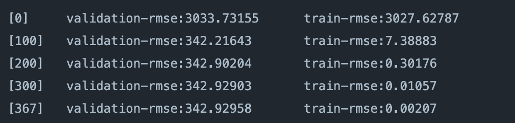 As you can see, the accuracy of our model starts off abysmal at a staggering 3033 root mean squared error, but quickly reaches its optimal 342.93. However, we aren’t done. We can use cross-validation, or XGBoost’s .cv() function to figure out the best RMSE our model can produce.
