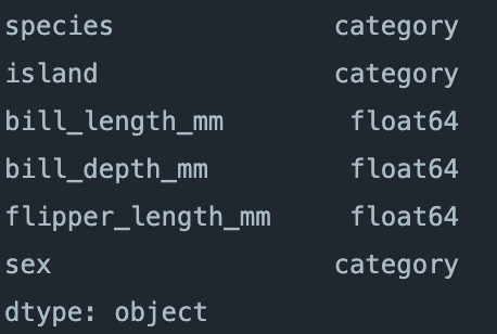 x, y = penguins.drop('body_mass_g', axis = 1), penguins[['body_mass_g']]Our dataset has some numerical values, and some categorical (string) values. Typically, we would have to deal with this ourselves, but XGBoost has a built-in capability for this. All we need to do is use the cast function .astype() in conjunction with a for loop to set these string values as the category type.