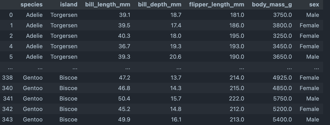 penguins.head()Note we used penguins.head() because this is a 343 row dataset. While usually you should be looking more deeply into a dataset and conducting some exploratory analysis to validate and ensure it’s ready to be worked with, we’re lucky enough to be using a built-in dataset that comes baked into Seaborn. Here is what the dataset’s first five rows look like: