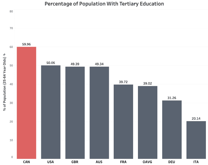 Intuitively, attracting FMNEs begins with an educated populace because enterprises want to hire adaptable employees that can be trained and trusted to produce positive results. An OECD published study found that a highly educated populace is the single biggest attractor of FDI. Taking this into consideration, examining the top FDI destinations in the world’s adult education levels reveals Canada as the distinct leader in tertiary (post-secondary) education.