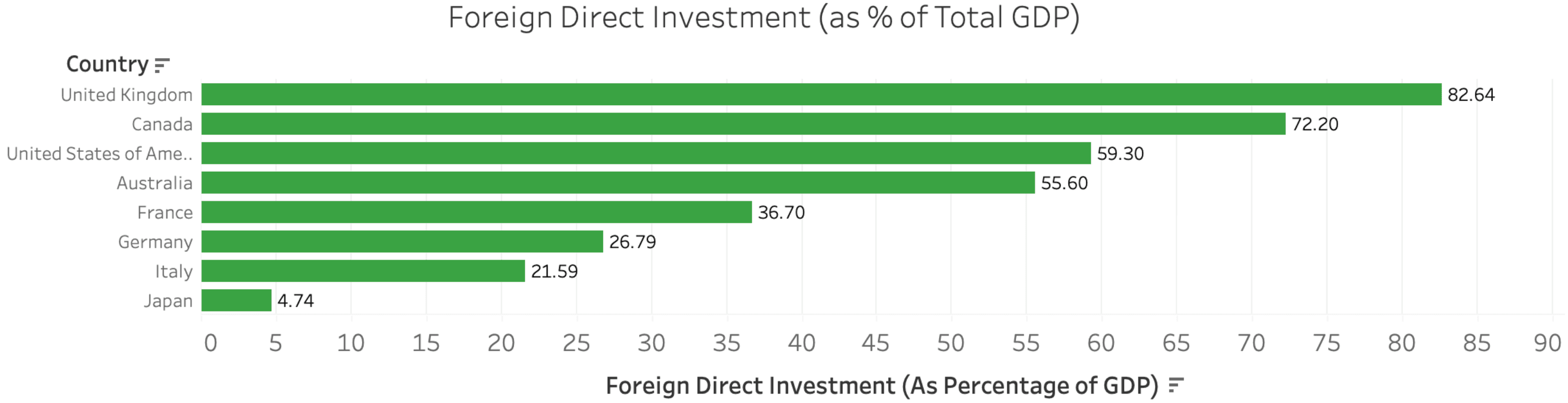 To preface this post: My dataset comes from the OECD, or the Organization for Economic Co-operation and Development. The organization works with governments around the world to maintain and improve a centralized economic/developmental database. I wanted to look at Canadian Foreign Direct Investment (FDI) and build a story by connecting the OECD FDI dataset to other datasets. Data sources are all linked in their respective section - with the base dataset (FDI data) accessible here. The FDI dataset is very simple, with just two columns: the countries, and the FDI inflow (can be in USD or % of GDP). This made it difficult to answer five questions with - especially questions I was interested in such as where FDI into Canada is coming from. That is why I will be using a few supportive datasets from equally reputale organizations. The first step of any data analysis pipeline is to gather data from reputable sources (in this case the OECD, Statistics Canada, and the Chicago Board Options Exchange), then clean the data using your method of choice (in this case using Python) before engaging in any analysis. This post will be less of a tutorial and more of a short blog guided by insights gathered through Tableau. This is a very different style than the rest of my works, but I hope you enjoy it nonetheless!