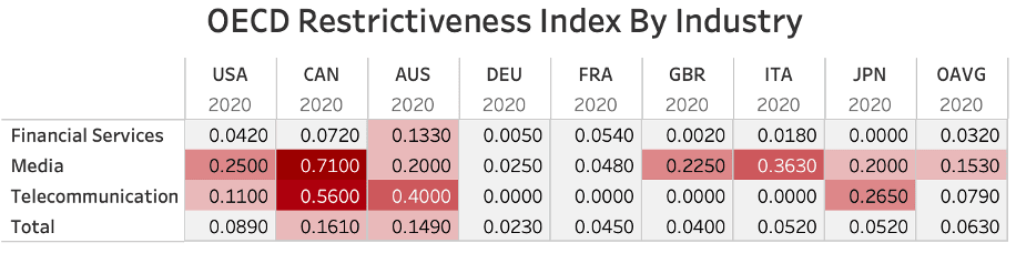 Canada’s restriction coefficient is evidently high relative to its peers. The total is, however, certainly skewed up heavily due to Canada’s incredibly restrictive telecommunications and media industries. These are two industries that Canadian regulatory bodies consider “distinguished” Canadian sectors wherein it is vital that Canadian culture must be “protected”.