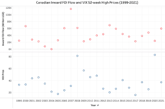 FDI inward flow in Canada equated to just over 72% of the country’s 2022 GDP, an important concern arises regarding whether a high GDP to FDI ratio exposes the host economy to increased economic vulnerability. Sharp changes in FDI inward flow (from henceforth referred to as FDI inflow) will have an impact on the Canadian economic landscape and could increase Canada’s economic vulnerability. We will explore this in further detail when we examine the VIX index.